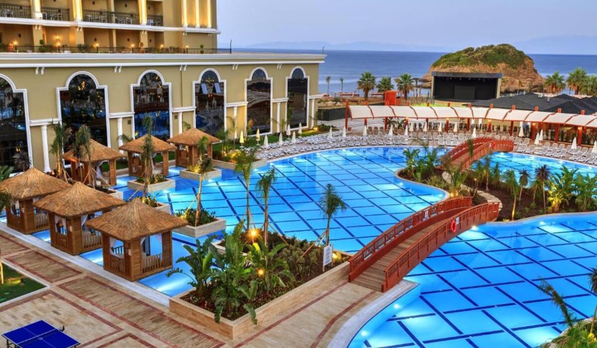 هتل Sunis Efes Royal Palace Resort & Spa یک هتل پنج ستاره لوکس و بزرگ در منطقه Ozdere نزدیک کوشآداسی است که بهدلیل موقعیت مستقیم روی ساحل خصوصی، طراحی مدرن و امکانات متنوع تفریحی و رفاهی، به یکی از گزینههای محبوب گردشگران برای اقامت در سواحل دریای اژه تبدیل شده است. این هتل با داشتن بیش از ۴۷۰ اتاق مجهز، استخرهای متعدد، پارک آبی، فعالیتهای ورزشی، مرکز اسپای کامل و سرگرمیهای خانوادگی، مقصدی مناسب برای تمام نوع سفر از جمله خانوادگی، زوجها و علاقهمندان به تعطیلات لوکس است.