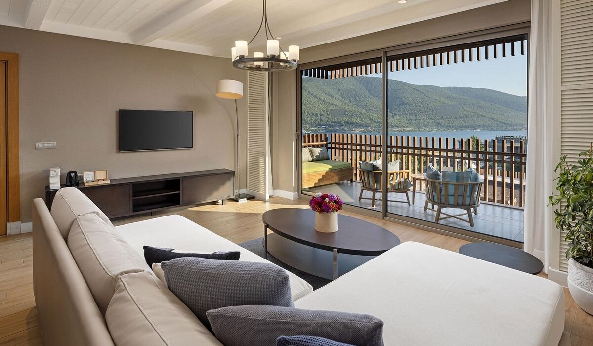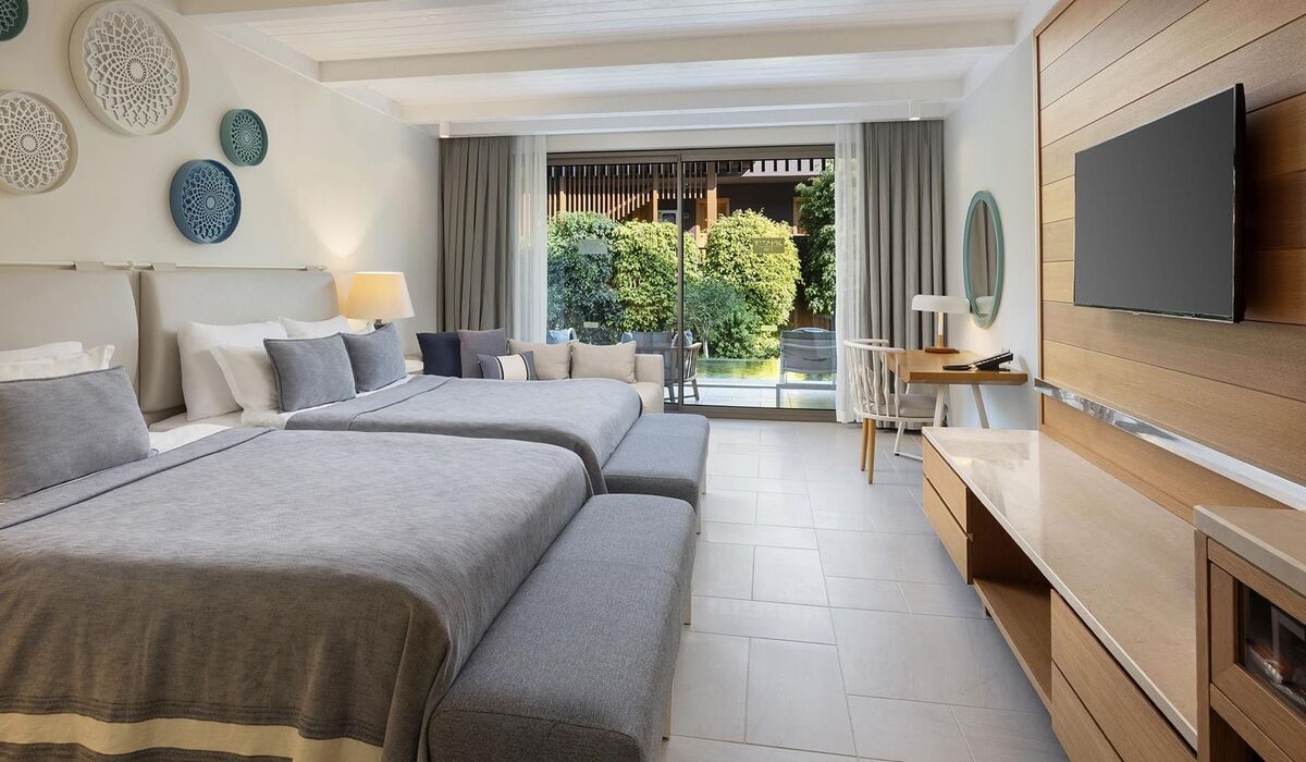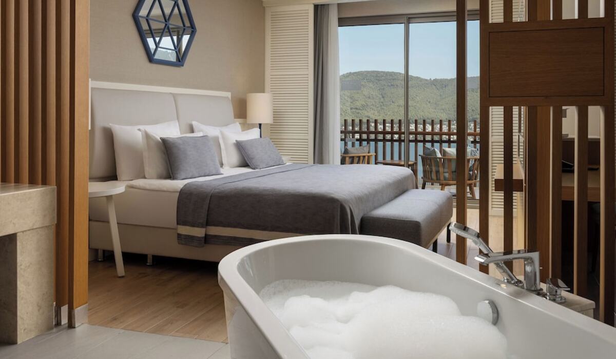 اتاق‌ها با طراحی چشم‌نواز و مبلمان باکیفیت، تخت‌های بزرگ (King) و فضای نشیمن مستقل، تجربه‌ای راحت و لوکس فراهم می‌کنند. در بخش دلوکس، نمای کامل به دریای اژه (Sea View) یکی از نقاط قوت اصلی است و بالکن اختصاصی امکان تماشای مناظر آبی و غروب‌های زیبا را به مهمانان می‌دهد.